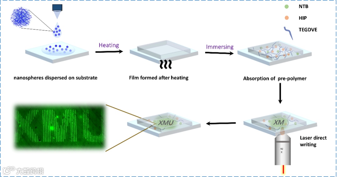 高分子薄膜是将2-(2-甲氧基乙氧基)甲基丙烯酸乙酯(DGMEMA)和聚甲基丙烯酸乙二醇(PEGDMA,Mn=550) 共聚形成的纳米球通过溶剂蒸发自组装而成。选择4,4',4'-三甲酸三苯胺(NTB)作为光敏剂,六氟磷酸二苯基碘鎓盐(HIP)为引发剂,三乙二醇二乙烯基醚(TEGDVE)为双光子聚合的单体。将薄膜浸入到前体溶液中,使聚合前体负载于膜中。然后,激光直写技术将激光焦点聚焦于薄膜内部,实现双光子聚合,在共聚焦荧光显微镜下可观察三维打印的图案。