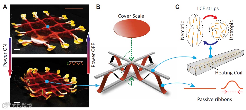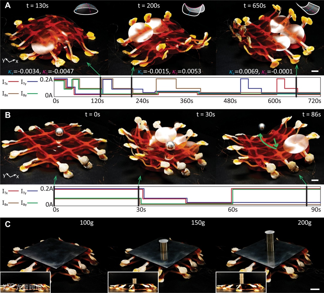 该设计由两层主动网格和一层被动网格构成夹心三明治结构,辅以盖板鳞片来构成连续的表面。主动网格由嵌入了加热电阻丝的液晶弹性体材料(LCE)构成,可在通电加热时收缩,起到肌肉般的作用;主动网格的收缩会造成由聚酰亚胺薄膜(Kapton)构成的中间层被动网格的屈曲变形,形成波纹状的支撑结构,起到骨架般的作用。根据电流大小的不同,上下两层主动网格在不同方向的局部收缩变形可以进行实时独立调节。由于对于壳体而言,其曲率取决于上下表面的局部应变,因此这种新型软体机器人可以通过调节输入到上下两层主动网格的电流自由变换曲率,形成各类曲面形状。