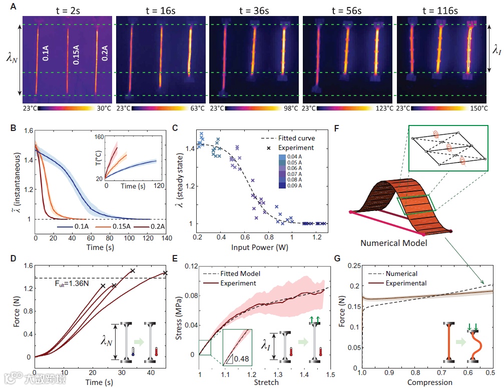 (A-E)LCE材料在电热驱动下的热-力学性质;(F-G)Kapton被动层的平面外屈曲变形。