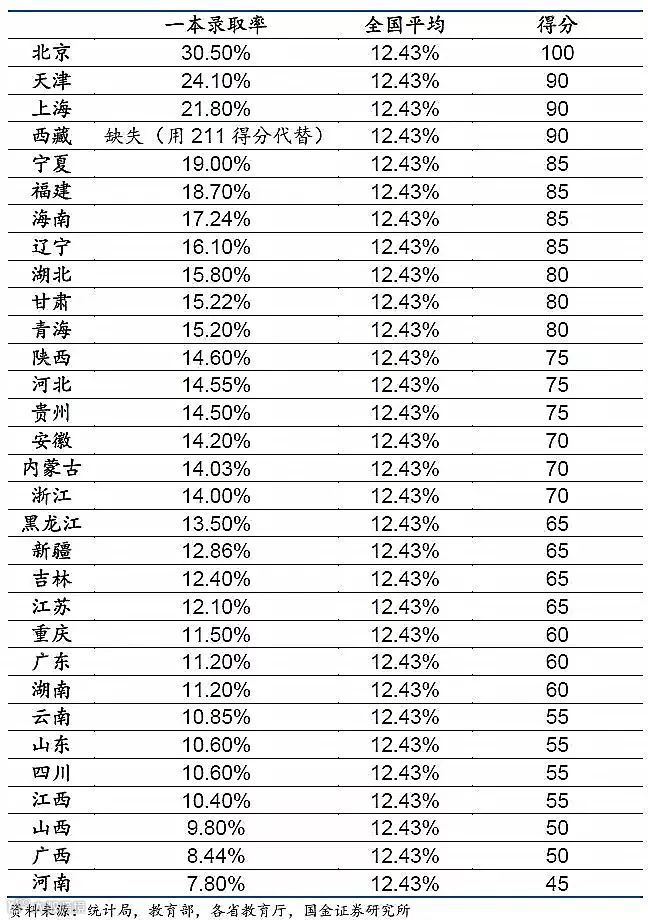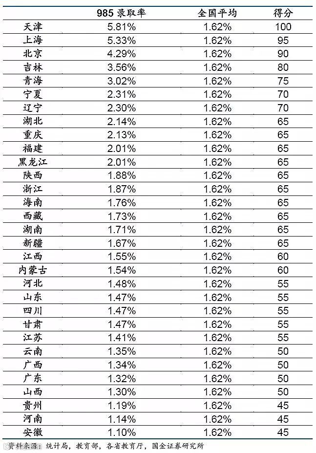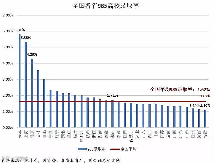 录取率是一个相当可测可比的指标,不管该地区好学校多寡,人口多寡,录取率总是一个比较客观可比的因素。我好学校少,但985整体录取率(考取率)高也行啊,我人少,但是别的学校给我们名额也相对更少,也没用,所以“录取率”是更客观可比的指标。