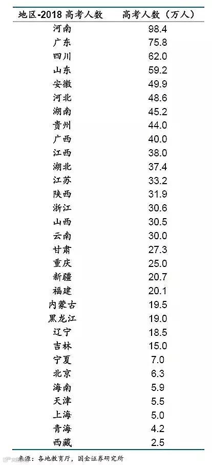 以2018的数据来看,河南近100万考生,广东75万,山东&四川&安徽也都是50万+的级别,但西藏,青海,上海等地高考人数不足5万。