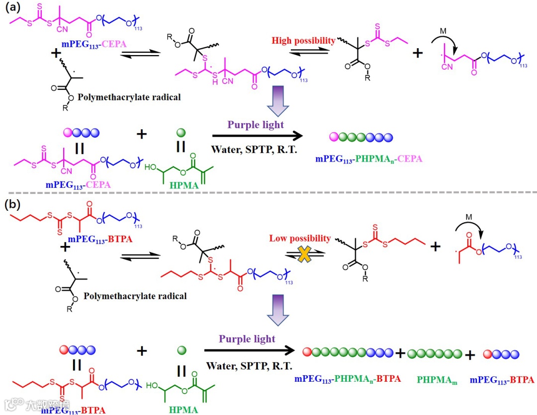 图1. mPEG113-CEPA与mPEG113-BTPA调控HPMA的非均相RAFT聚合的机理示意图。