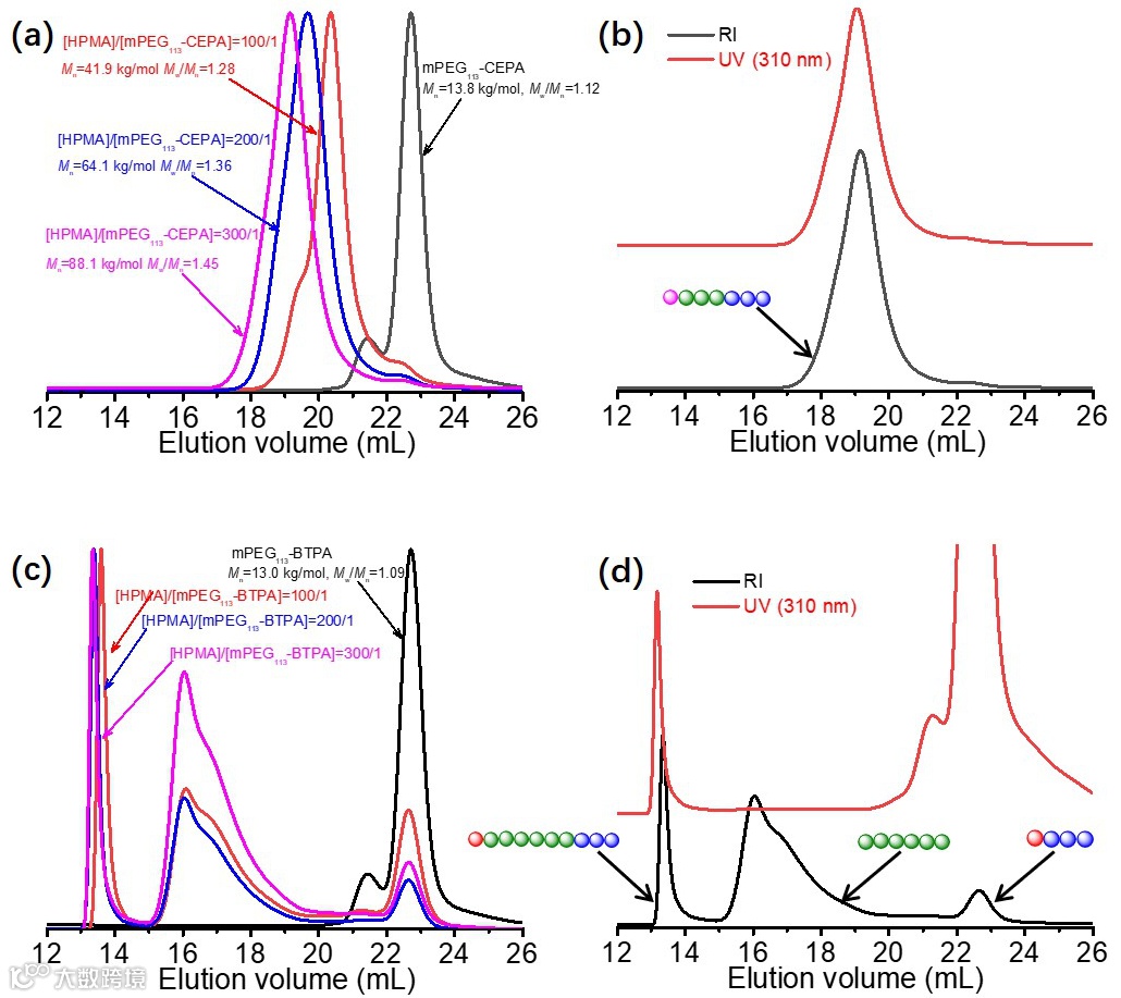 图2. (a, b) mPEG113-CEPA调控HPMA非均相RAFT聚合所得产物的GPC图,(c, d) mPEG113-BTPA调控HPMA非均相RAFT聚合所得产物的GPC图。