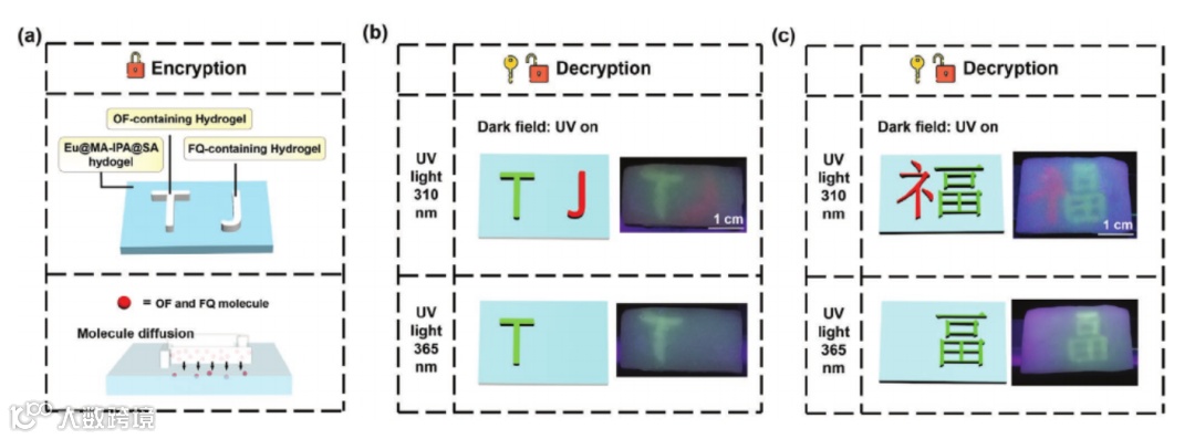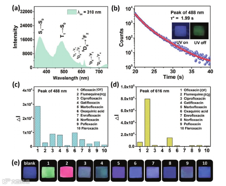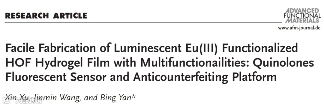 近日,同济大学化学科学与工程学院闫冰教授课题组以氢键有机框架材料为功能化对象,制备了一种铕离子功能化的氢键有机框架水凝胶薄膜,该薄膜具有长达1.99秒的长余辉,可用于两种喹诺酮(氧氟沙星和氟甲喹)的荧光检测,并且可以通过利用对两种喹诺酮独特的荧光响应实现信息的加密、解密和解码。相关研究成果在线发表于国际知名期刊《先进功能材料》(Advanced Functional Materials )(IF = 16.836) (DOI: 10.1002/adfm.202103321)。