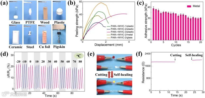图3 离子凝胶弹性体的自粘附、自修复和抗冻性能离子凝胶弹性体(a)可自发粘附于多类基体表面;(b)在塑料、金属和玻璃表面的粘附强度;(c)在金属表面的可逆粘附性能;(d)离子凝胶弹性体在宽温度范围内对形变的稳定电阻响应;(e)离子凝胶弹性体经切断和自修复后,点亮LED灯泡的数码照片;(f)离子凝胶弹性体可快速自修复并实现导电功能的恢复