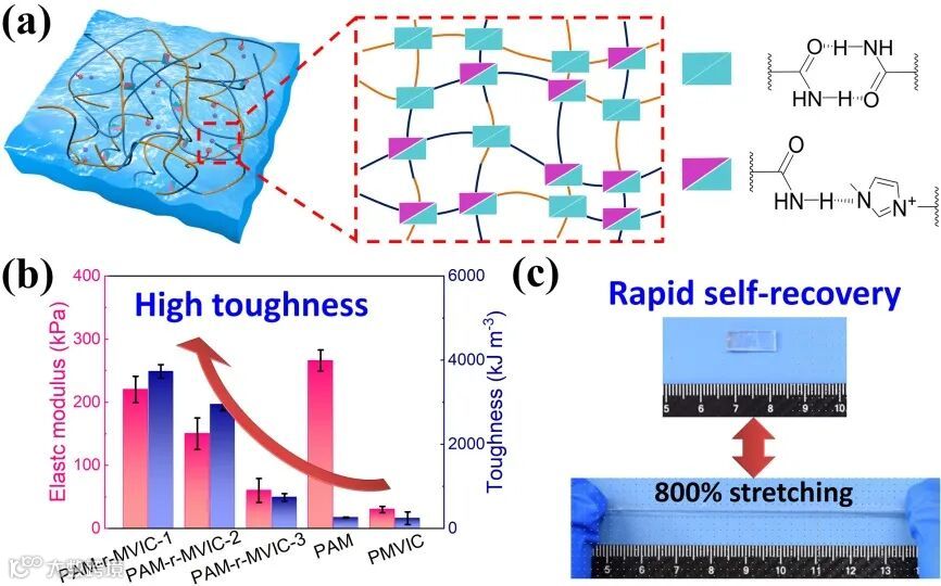 东华大学纳米复合与能源材料团队提出了氢键网络致密化策略,在离子凝胶体系中设计了起到分级响应作用的高密度氢键网络结构,根据氧、氮电负性的不同,分别利用羟基和氨基之间以及咪唑上3-N和氨基之间形成了多级氢键网络结构(图1(a)),进一步获得了高可拉伸、快速应力恢复、抗冻、自粘附/自修复的透明离子凝胶弹性体材料(PAM-r-MVIC)。离子凝胶弹性体骨架中的咪唑类离子结构可锁定对离子,使凝胶网络稳定性提高且离子不易流失。高密度的多级氢键网络结构,使得所制备的离子凝胶弹性体兼具了高力学强度和链段动态能力,强氢键网络结构作为稳定交联实现力学强度的提升,而弱氢键网络结构能够在形变过程中通过断裂吸收能量,实现力学韧性的提升和快速应力恢复性能(图1(b-c))。