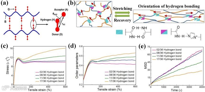 图2 高密度氢键结构离子凝胶弹性体的力学强韧化机制和扩散行为的模拟计算结果 (a)具有5个接枝臂的离子凝胶弹性体的耗散粒子动力学模型;(b)拉伸和恢复过程中高分子链和氢键结构取向和解取向的示意图;(c)拉伸条件下随氢键含量增加的应力-应变曲线和(d)高分子链有序度-应变曲线;(e)不同氢键网络密度的离子凝胶弹性体分子链段随时间的扩散行为