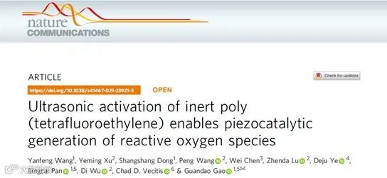上述研究以“Ultrasonic activation of inert poly(tetrafluoroethylene) enables piezocatalytic generation of reactive oxygen species”为题于2021年6月9日在线发表在Nature Communications 。论文第一作者为博士生王炎锋,通讯作者为高冠道教授。共同作者包括现代工程与应用科学学院2020届硕士毕业生徐烨明、环境学院2020届硕士毕业生董上上,以及南京大学现代工程与应用科学学院王鹏教授、鲁振达教授、吴迪教授,化学与化工学院叶德举教授,南开大学陈威教授、哈佛大学Chad Vecitis教授以及团队带头人潘丙才教授。南京大学现代工程与应用科学学院张善涛教授,化学与化工学院沈群东教授,物理学院屠娟教授以及环境学院王伟伟博士参与了论文讨论,现代工程与应用科学学院博士生席中男和李晨博士对PFM测试做出了贡献。研究得到了国家自然科学基金、国家重点研发项目以及江苏省科技厅的资助。