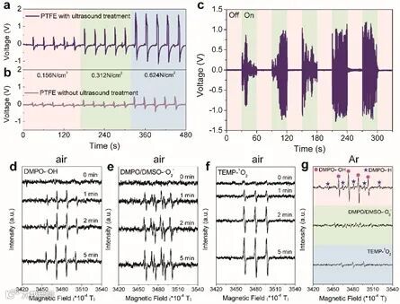 进一步,本研究通过施加外力并测量开路电压来揭示 PTFE 驻极体的压电特性(图 3a、b)。随着外加压力从 0.156 增加到 0.624 N/cm2,开路电压从 0.5 V增加到 1.8 V。此外,活化的PTFE膜在超声波的作用下能产生可重现的压电电压(图 3c)。这揭示了惰性的PTFE超声催化活性的基本过程及机制,包括1)PTFE在超声压力场下的驻极化活化,以及2)高频超声压力波持续刺激压电PTFE驻极体产生迅速交变的内部电场,从而驱动电荷到PTFE/水界面并最终产生ROS(图 3d, e, f)。