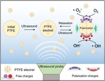活性氧物种(ROS)的可控生成在生物、化学和环境等领域具有重要的作用。特别是在声动力学过程中,凭借高组织穿透性和定向引导特点,压电催化(piezoelectric catalysis)可原位高效产生ROS。然而,目前报道的压电ROS催化剂压电系数较低(3-105 pC/N),或对环境安全有害(如PZT中的Pb)、化学稳定性差,限制了压电催化的发展。因此,开发新型压电材料是亟待解决的挑战。近期,高冠道教授课题组等人开发了可诱导传统惰性的聚四氟乙烯(PTFE)颗粒形成压电驻极体(electret)方法。研究显示,对PTFE驻极体进行连续超声辐照可产生ROS,并且其产生速率显著高于已见报道的压电催化剂。该项研究颠覆了人们对惰性PTFE的认知,也开辟了惰性PTFE在环境污染治理、杀菌消毒领域的新应用。