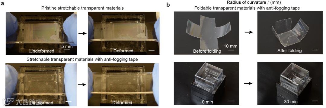 图2. 可拉伸防雾胶带在柔性、可拉伸、可折叠透明材料上的防雾效果测试