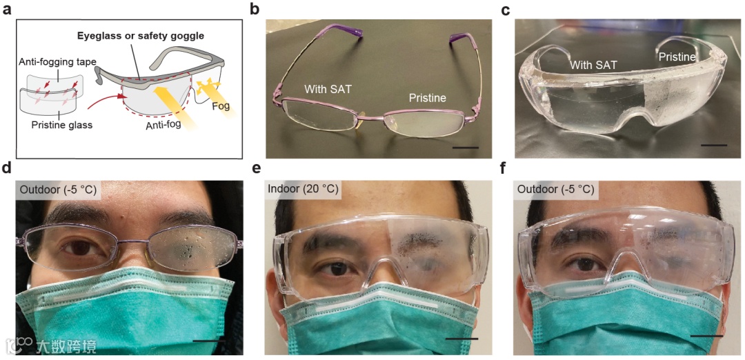 防控新冠疫情期间,很多人戴上了平时不戴的口罩,但戴上口罩后,眼镜或者护目镜非常容易起雾,影响视野范围。眼镜或者护目镜的起雾问题在冬天户外运动时尤为严重。MIT团队进一步测试了可拉伸防雾胶带对于防止眼镜和护目镜雾化的优良效果(图3)。