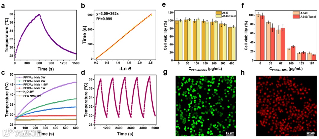 得益于Au纳米粒子的物理性质,文中制得的PFC/Au-5N复合纳米结构展现出了良好的光热性能。在808 nm激光照射下能够产生明显的光热效应,其光热转化效率约为17.8%。窦红静教授课题组对这一复合纳米结构的光热效应在治疗癌症领域的应用做了初步的可行性试验。在体外的细胞过程中,PFC/Au-5N复合纳米结构本身几乎没有明显的细胞毒性,并且能够在808 nm激光的照射下对A549细胞产生明显的杀伤效果。这一结果展现出了PFC/Au复合纳米材料在生物医用领域的应用潜力。