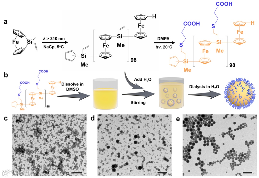 图 1 (a) 两亲性聚二茂铁硅烷基均聚物高分子(PFC)的合成, (b) PFC胶束的制备,(c-e)不同尺寸的PFC胶束的TEM图像(标尺:500nm)。