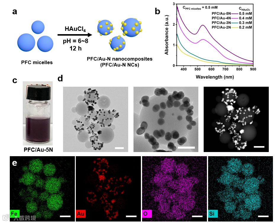 图2 (a)PFC/Au复合纳米结构制备流程示意图,(b)不同条件下制得的复合纳米结构的紫外-可见吸收曲线,(c)PFC/Au-5N分散液外观,(d-e)PFC/Au-5N复合纳米结构的TEM,HAADF-STEM和EDS-STEM结果。