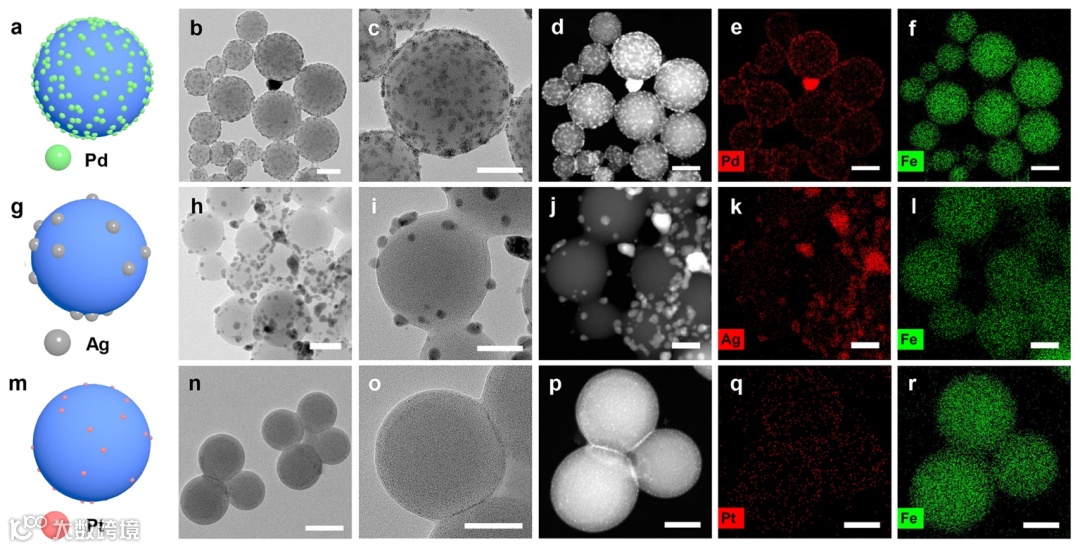 图3 (a-f)PFC/Pd复合纳米结构的示意图及其TEM,HAADF-STEM和EDS-STEM结果,(g-l)PFC/Ag复合纳米结构的示意图及其TEM,HAADF-STEM和EDS-STEM结果,(m-r)PFC/Pt复合纳米结构的示意图及其TEM,HAADF-STEM和EDS-STEM结果。