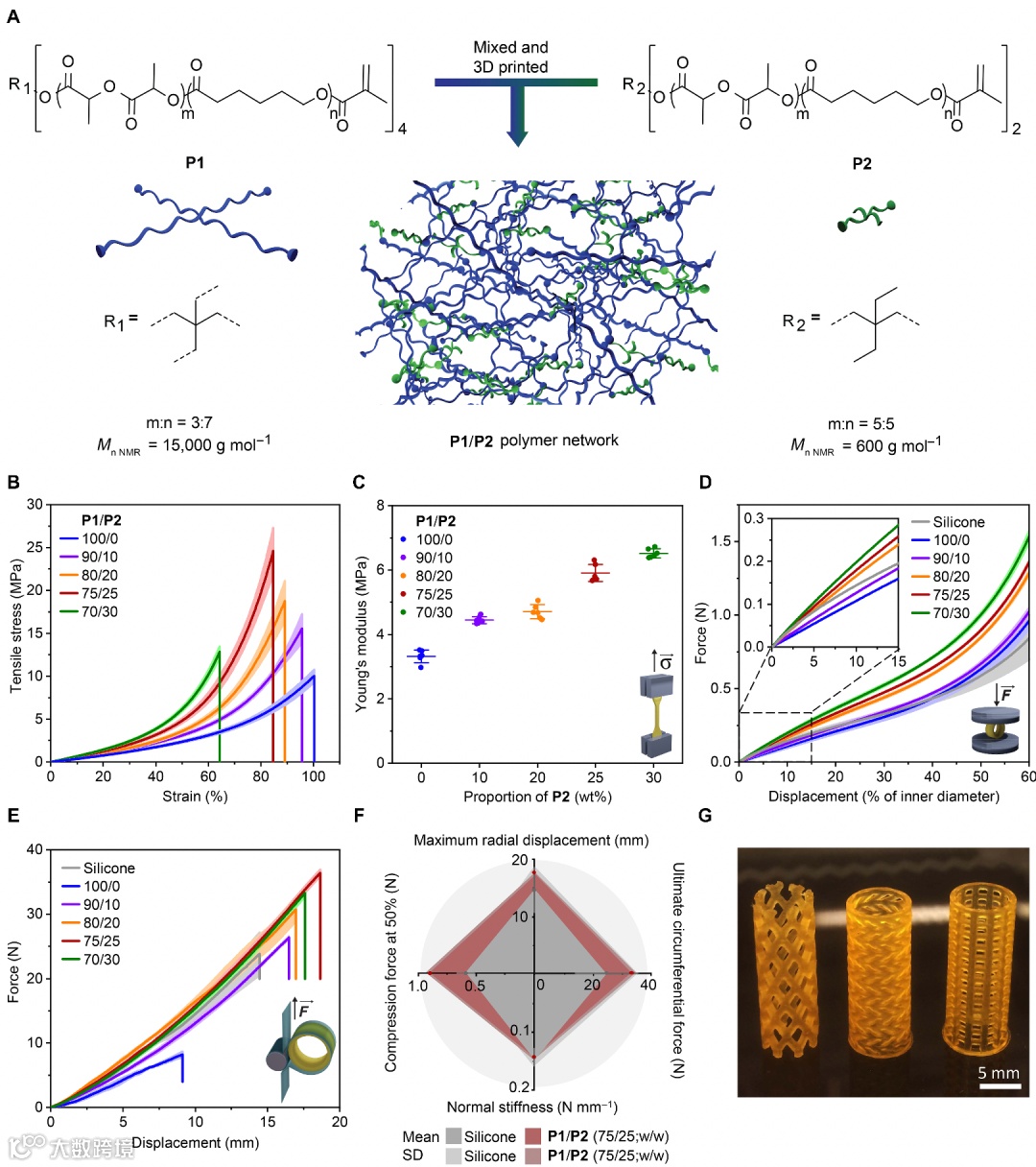 近日,苏黎世联邦理工学院(ETH Zurich)药学系Jean-Christophe Leroux教授与鲍寅寅研究员课题组联合材料系André R. Studart教授、苏黎世大学医院(UZH)Daniel Franzen医师以及苏黎世动物医院Brigitte von Rechenberg教授报道了基于DLP的光聚合3D打印个性化可吸收气管支架,其力学性能媲美商业化硅胶支架且可以被组织完全吸收。研究人员利用D,L-丙交酯和ε-己内酯两种单体无规共聚,结合丙烯酸酯功能化合成了一系列具有不同分子量的液态光活性聚合物。利用可加热DLP打印机,成功实现了较高分子量可降解聚合物的3D打印。通过对两种不同结构与分子量的聚合物比例的调控,可以得到一系列不同杨氏模量和断裂伸长率的3D打印弹性体。其中,分子量15000的星型聚合物与分子量600的线性低聚物按重量比75:25混合时在3D打印后可以达到与硅胶弹性体不相上下的力学性能(图 1)。利用这一优化组合,可以制备不同几何构型的高精度3D打印支架。