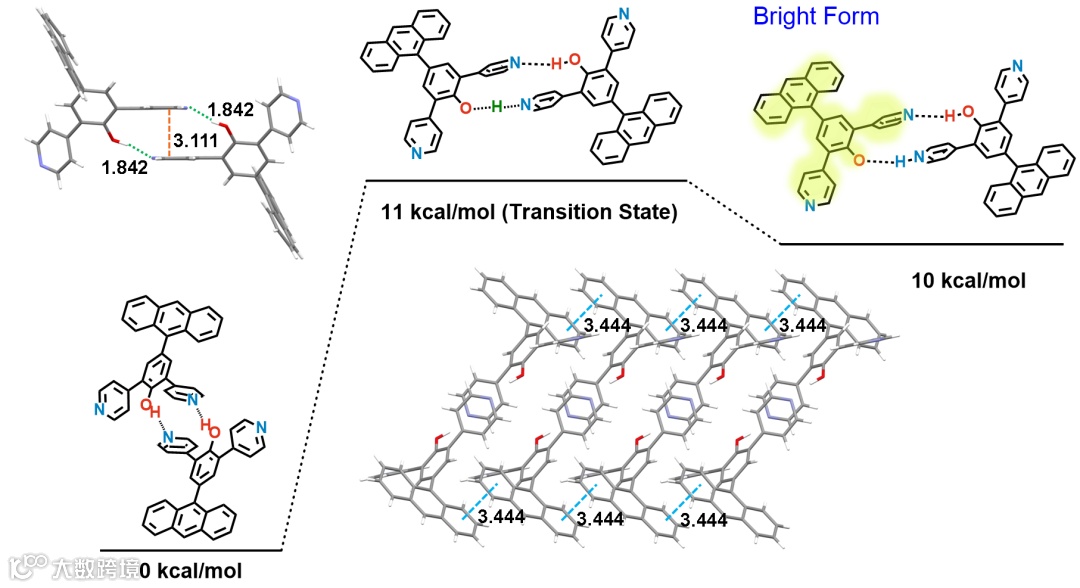 研究人员通过不断的尝试,得到了一种经过蒽修饰的双吡啶苯酚的化合物的单晶数据。这一数据证实了这种双氢键的存在。在这一单晶的基础上经过计算发现,这一双氢键结构发生质子转移的能垒很低,这也是能发生质子转移的主要原因。