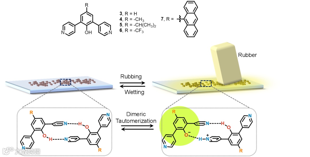 近日,复旦大学的朱亮亮课题组发现一种可以通过双氢键形成双吡啶苯酚类化合物的交联体。这种体系能够在固态稳定存在,并且在橡胶类材料的摩擦所形成的微弱电场的诱导下,双氢键二聚体结构中可以发生质子转移。这一过程瞬间产生了一种从暗态到明态的互变异构体,从而使材料的荧光量子产率提高了450倍以上,产生固态“点亮”效果。由于互变异构的可逆性,这一类材料可以重复使用,从而开发出加密应用。此外,对结构的进一步修饰可以实现不同的性能拓展,为新一代智能材料的设计开辟了更多的可能性。