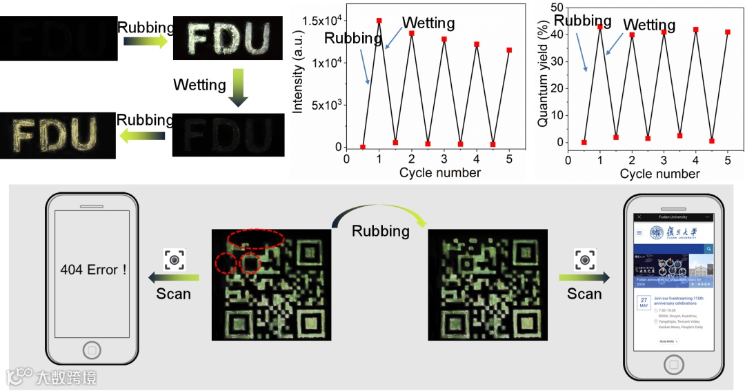 对于这一有趣的性质,研究人员还进行了其循环实验的研究,经过摩擦的化合物在缓冲溶液中浸泡后,其发光性能会明显减弱。对其干燥处理后再进行摩擦即可重新点亮。这一循环过程中,化合物的量子产率没有明显的降低。研究人员还设计了以此为基础的防伪二维码,其中,对大部分信息点位喷涂与双吡啶苯酚发光相近的材料为基础发光物质,选取其中的几个信息点位喷涂双吡啶苯酚材料,这样便可以得到一幅在紫外灯下有缺失的二维码。通过橡胶的摩擦后,这些隐藏的信息点位被点亮,在紫外灯下便可获得完整信息的二维码。这一信息防伪技术在未来的信息社会中将有着巨大的发展潜力。