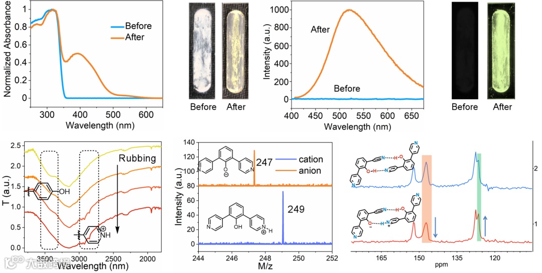 通过光谱分析,研究人员发现,在橡胶摩擦的前后,化合物在400 -500 nm之间出现了新的吸收带,使得其在日光灯下表现为黄色固体粉末,而在525 nm附近出现了一个从无到有的发射峰,使其在紫外灯下发出明亮的黄绿色的荧光,量子产率达到了45%。并且通过红外,质谱,固体核磁等表征手段,均捕捉到了这一质子转移的过程。