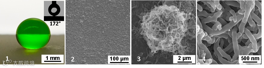 针对目前超疏水涂层存在的问题,加拿大Simon Fraser大学于化忠教授团队开发了一种全新的超疏水涂层的制备技术。该涂层基于化学计量学控制的有机硅化合物的水解和聚合反应,直接形成具有较小的表面张力的、多级结构的微纳米颗粒(图1)。