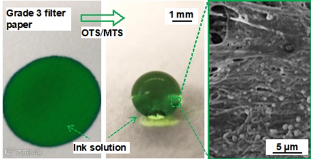 于化忠教授团队长期关注传统硅烷化反应在表面化学和生物芯片方面的应用。前期的工作包括通过混合长链和短链硅烷与普通实验室用滤纸进行反应,制成超疏水、可修饰的芯片基底。和太原理工大学李晓春教授团队合作,通过光刻的方法,简易制作点阵式纸基芯片用于环境样品的酸碱度和污染物的定量检测(图3)。在此基础上,于化忠教授的研究团队将上述方法也用于修饰玻璃纤维滤纸,以制作没有荧光背景的超疏水基底,用于制备更为广泛使用的荧光扫描为检测手段的芯片和器件。