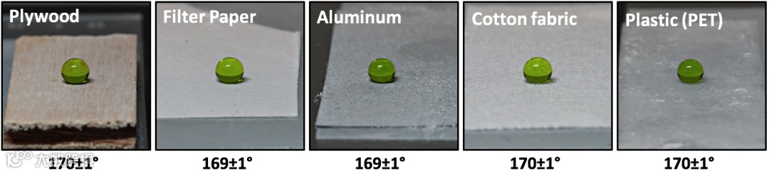 4. 超广谱适用:本涂层已经在木材、玻璃、棉布、滤纸、铝片、塑料等材质表面测试,可采用最方便的浸泡或者喷涂的方法处理材料表面 (图2)。