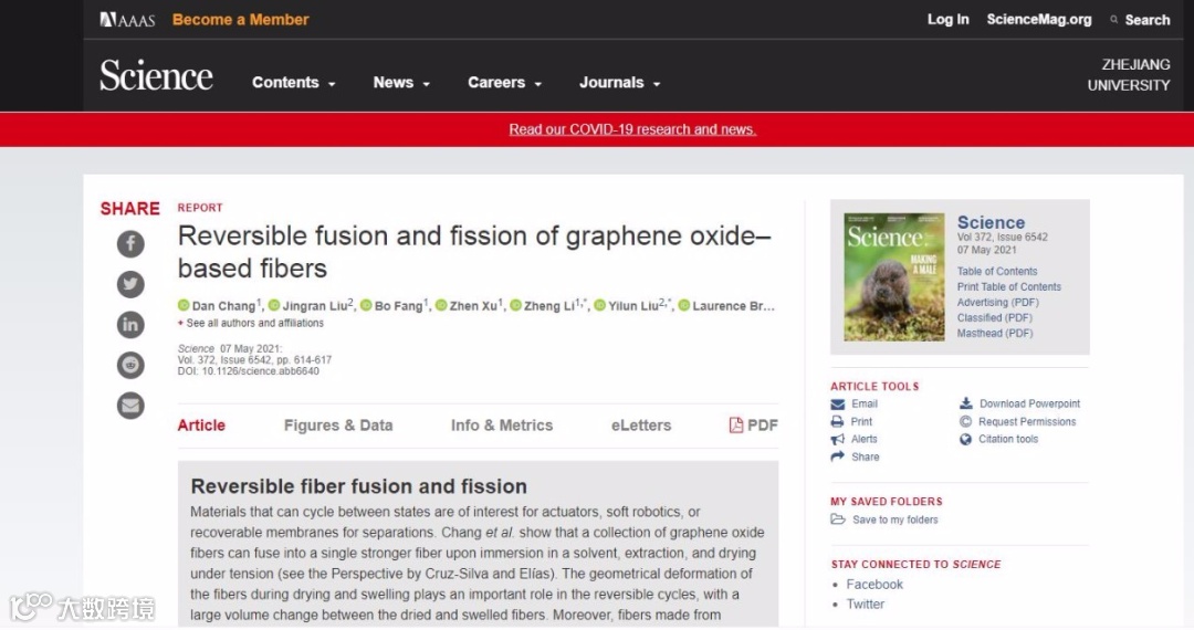 最近,浙江大学高分子系纳高课题组高超教授(共同通讯作者)、李拯(共同通讯作者)博士利用氧化石墨烯(Graphene oxide,GO)纤维的二维基元结构和大体积收缩动态特性首次实现了宏观材料的精确可逆融合与分裂。合作者西安交通大学刘益伦教授(共同通讯作者)及其博士生刘静冉对这一过程进行了力学分析及有限元模拟。相关成果以 “Reversible fusion and fission of graphene oxide based fibers”为题发表在《Science》(Science 372, 614–617 (2021). DOI: 10.1126/science.abb6640)上。论文的第一作者为浙江大学高分子系的博士生畅丹。就此工作,日本长野大学Rodolfo Cruz-Silva和美国宾汉顿大学Ana Laura Elías在同期Science发文进行了评论。