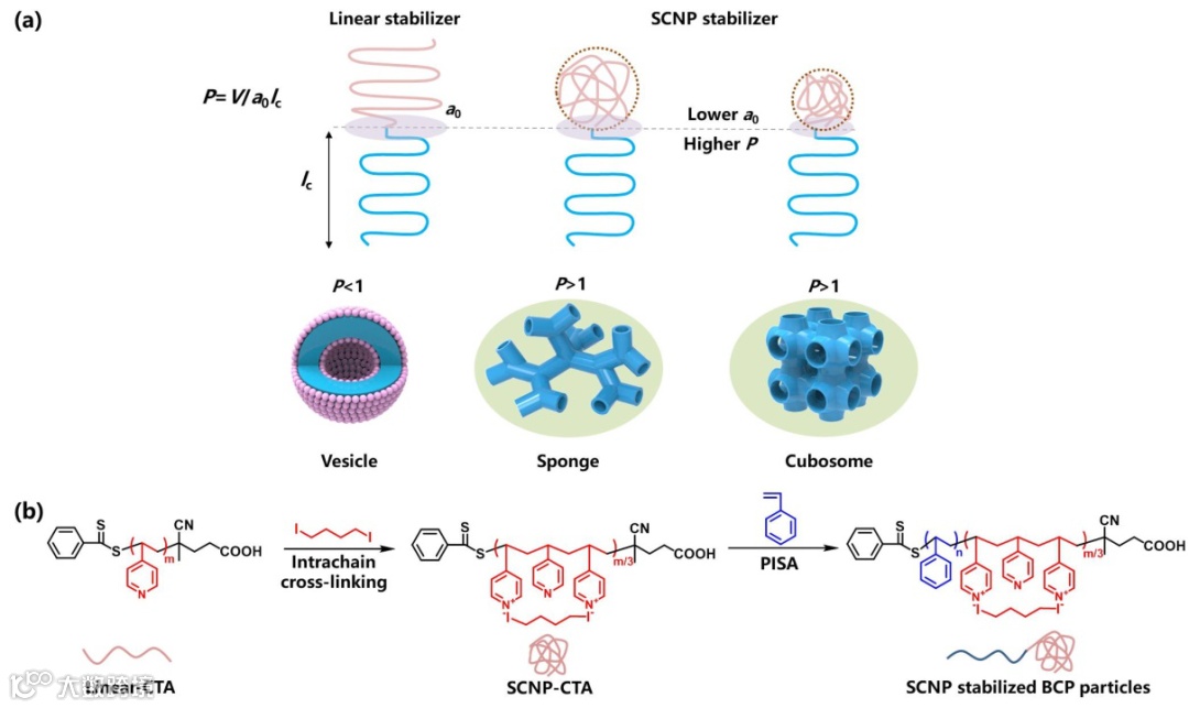 图1 (a)稳定链段构型对于堆积参数和粒子形貌的影响;(b)基于P4VP(SCNPx%)35-b-PSn的SCNP-PISA体系。