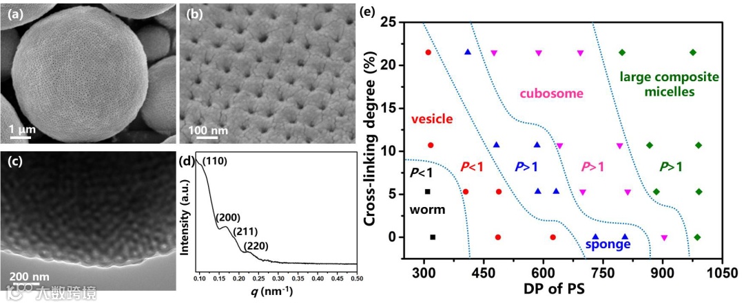 图2 (a-d)P4VP(SCNP5.3%)35-b-PS699聚合物粒子形貌结构表征;(e)P4VP(SCNP)35-b-PSn体系形貌相图。