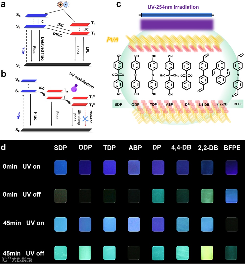 图1. (a-c) 实现聚合物基紫外刺激响应的磷光发射策略;(d) 八种聚合物基掺杂体系在持续辐照45分钟前后的荧光和磷光发射图片