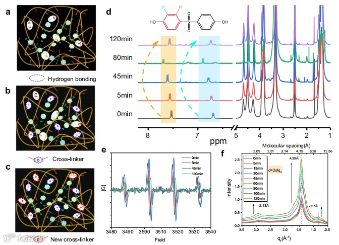 研究结果表明,在利用254nm的紫外光源持续辐照之后,其含有大量羟基的聚合物基质PVA中的羟基会在长时间的辐照过程中脱水交联,形成刚性的醚键(C-O-C)。相对于掺杂体系中羟基构成的氢键网络而言,这种新形成的化学键会进一步抑制磷光体的非辐射跃迁,使磷光体在激发后会有性能优异的磷光发射 (图2)。