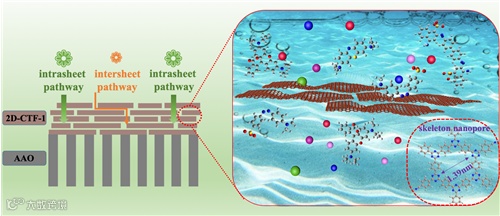 (2)共价三嗪框架分子筛分膜(CTF-1):二维共价三嗪框架材料(2D-CTF)是一类由C、N元素组成的具有三嗪环结构的二维共价有机框架材料,具有优异的化学结构稳定性和尺寸可调的面内结构孔,是一类极具潜力的二维材料分离膜基元体。传统的共价三嗪框架材料制备条件较为苛刻,通常基于离子热方法利用熔融氯化锌作为催化剂在高温条件下聚合而成,这使得合成产物中存在骨架结构碳化缺陷以及锌离子的残留,导致分离膜的结构及性能缺陷。课题组利用三氟甲磺酸和二氯甲烷形成的界面作为聚合反应的2D微界面,制备了具有寡层结构的2D-CTF-1纳米片层材料,见图2,该二维纳米材料具有优异的溶剂分散性。通过多层组装的方法制备了2D-CTF-1分离膜,研究发现片层组装方式更倾向于AA堆叠,通过改变压力研究与通量之间的关系发现面内孔对通量贡献率约为75%、层间通道贡献约为25%,基于面内孔径尺寸实现了不同尺寸、不同电荷的染料/分子精准筛分性能,见图3。(《功能高分子学报》,2019,32,610-616;Journal of Membrane Science 595 (2020) 117525)。