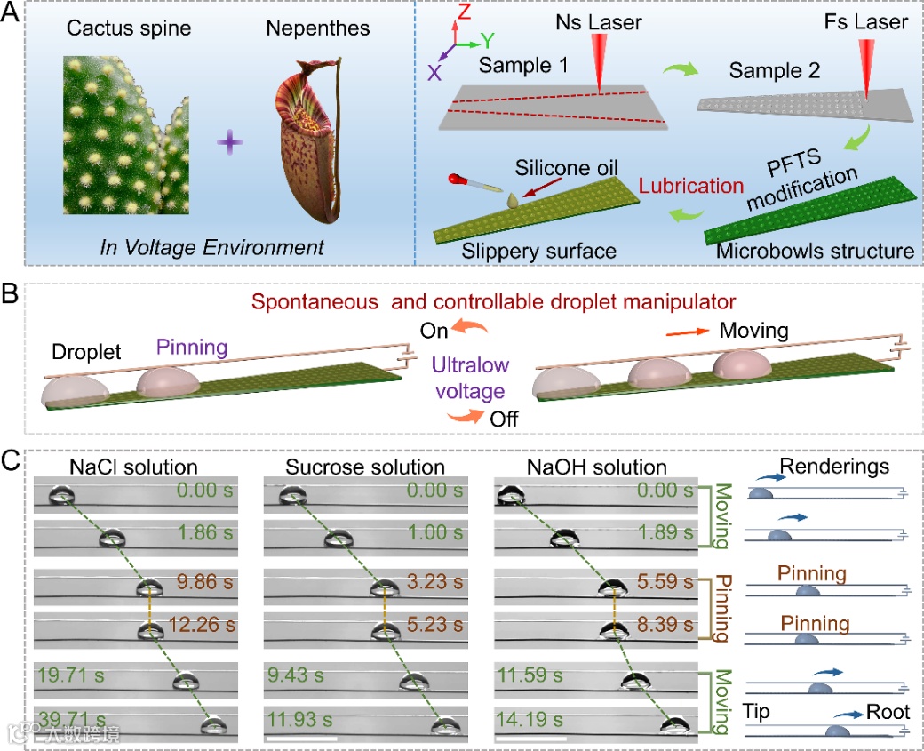 受仙人掌尖刺通过结构梯度实现高效水雾收集的启发,基于猪笼草光滑表面对液滴的排斥性,利用飞秒激光微纳精密制造技术制备了光滑的多微碗楔形衬底并采用在外加超低电压刺激下,实现了对多流态液滴的自驱动和电制动协同控制以及对微样的分析与检测。