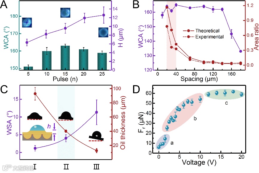 通过在楔形结构表面构建出具有多微碗结构的超亲水界面,并将其表面功能化和注入润滑液体,在外加低电压条件下,作者构建了依靠拉普拉斯压力差驱动和电压提供的静电力制动的高效协同微液滴操控。另外,对微结构的参数、表面润湿性、润滑油以及电制动液滴的影响因素进行了对比实验,并得出最佳参数区间。