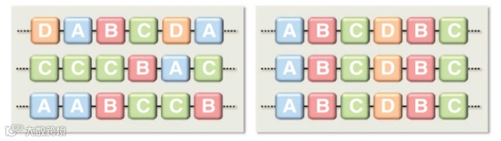 图1. 随机序列结构聚合物(左图),精确序列结构聚合物(右图)。