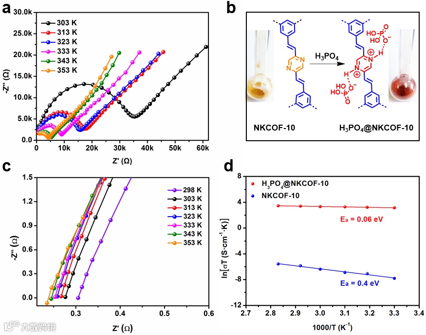 图2.(a)不同温度下NKCOF-10的阻抗谱图(90%RH);(b)NKCOF-10的质子化;(c)不同温度90%RH下H3PO4@NKCOF-10的阻抗谱图;(d)NKCOF-10和H3PO4@NKCOF-10Arrhenius谱图。