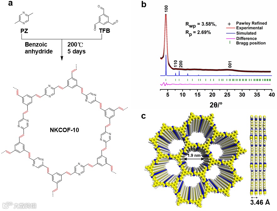 图1.NKCOF-10的合成路线和结构模拟数据图