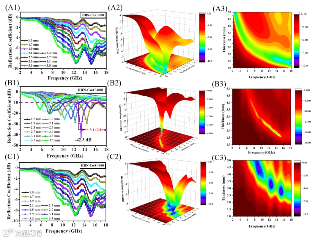通过碗状聚苯乙烯磺化(HBSPS),2-甲基咪唑钴盐ZIF-67金属有机框架结构负载生长及在惰性气氛中高温热解,制备系列空心碗状的氮掺杂钴/碳多孔纳米复合材料(HBN-Co/C)。HBN-Co/C独特的多级多孔结构一是有利于电磁波在碗状结构的凹面产生多次反射/散射,增强耗散效果;二是通过精控制空心结构间距、比表面积和氮掺杂钴/碳杂原子多种功能界面,导致电磁波与材料界面的多重极化,提升入射电磁波吸收效果(图2)。当厚度为1.9 mm时,最低反射系数为-42.3 dB(13.3 GHz);当厚度为1.7 mm时,-10 dB以下的有效吸收带宽可达5.1 GHz。相比本体材料,吸波性能大幅提升,密度大幅降低,可为轻质高效吸波材料多层级结构设计提供新的视角。