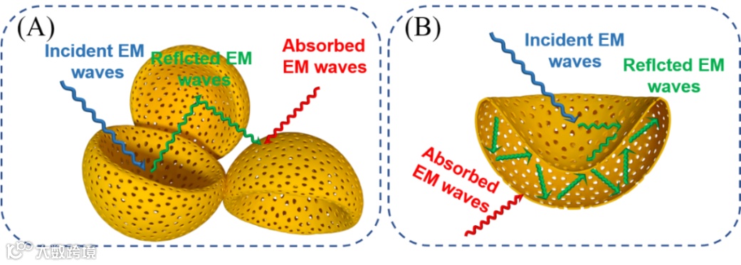 图2 空心碗状的氮掺杂钴/碳多孔纳米复合材料电磁波吸收性能及凹面反射/散射/耗散示意图