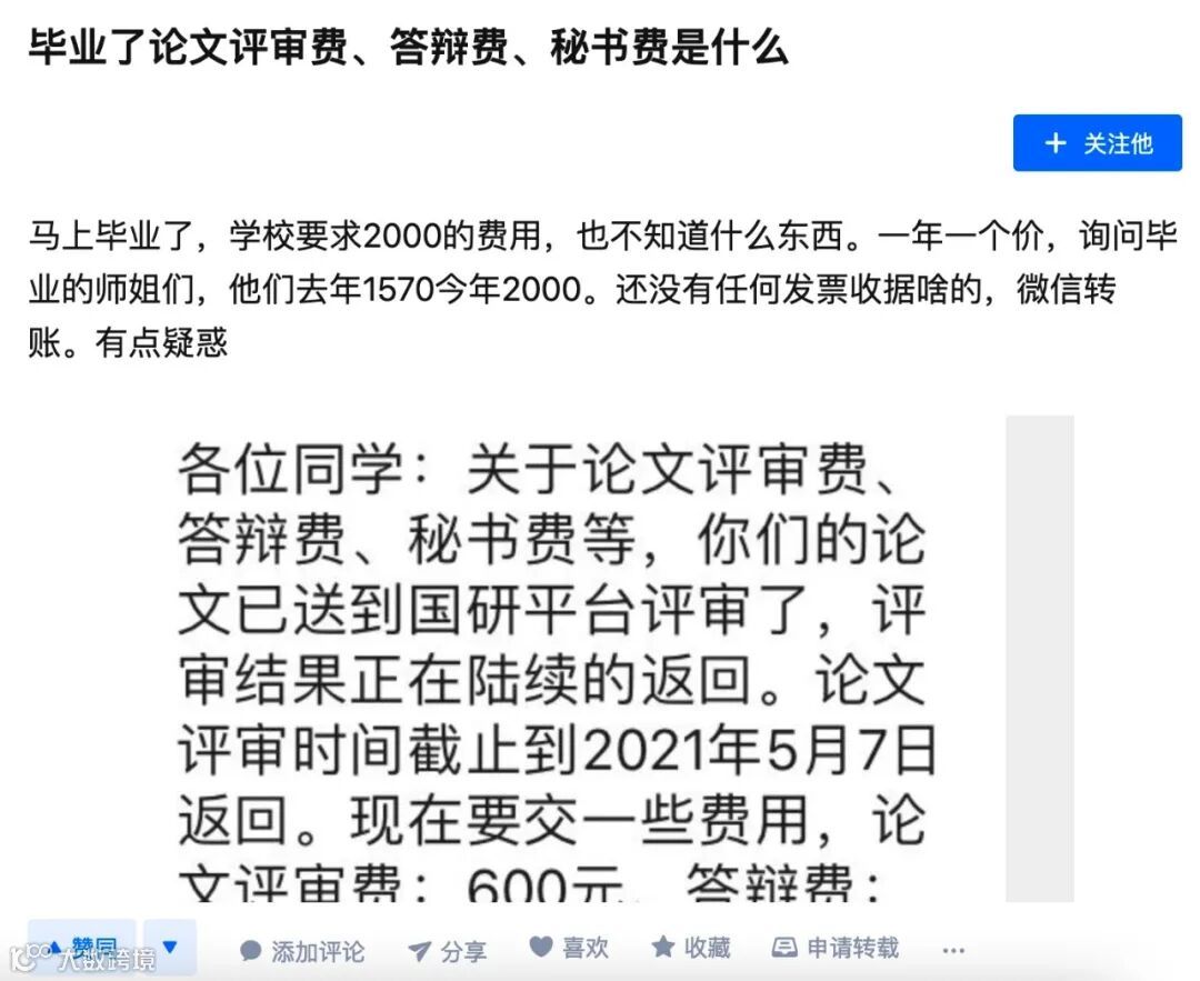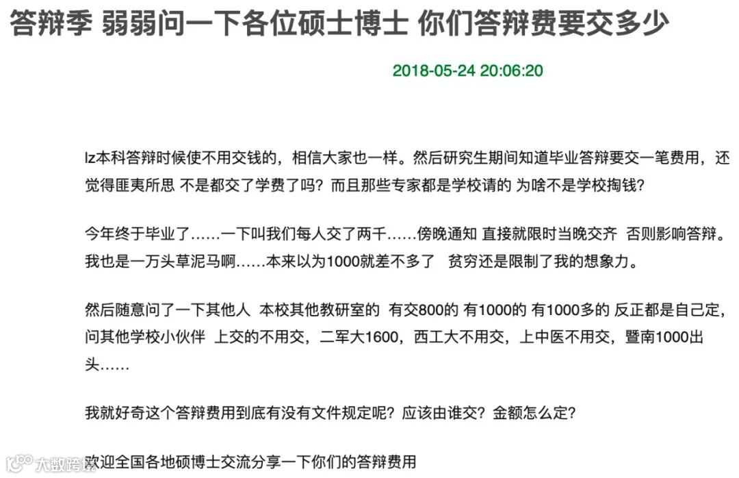 更有甚者花费突出天际,开题和毕业答辩都要花钱,而且是一位专家 2000 元,参加一次就要上万 。部分学校正式答辩前还有预答辩,即便知道是演习,同样要交钱。