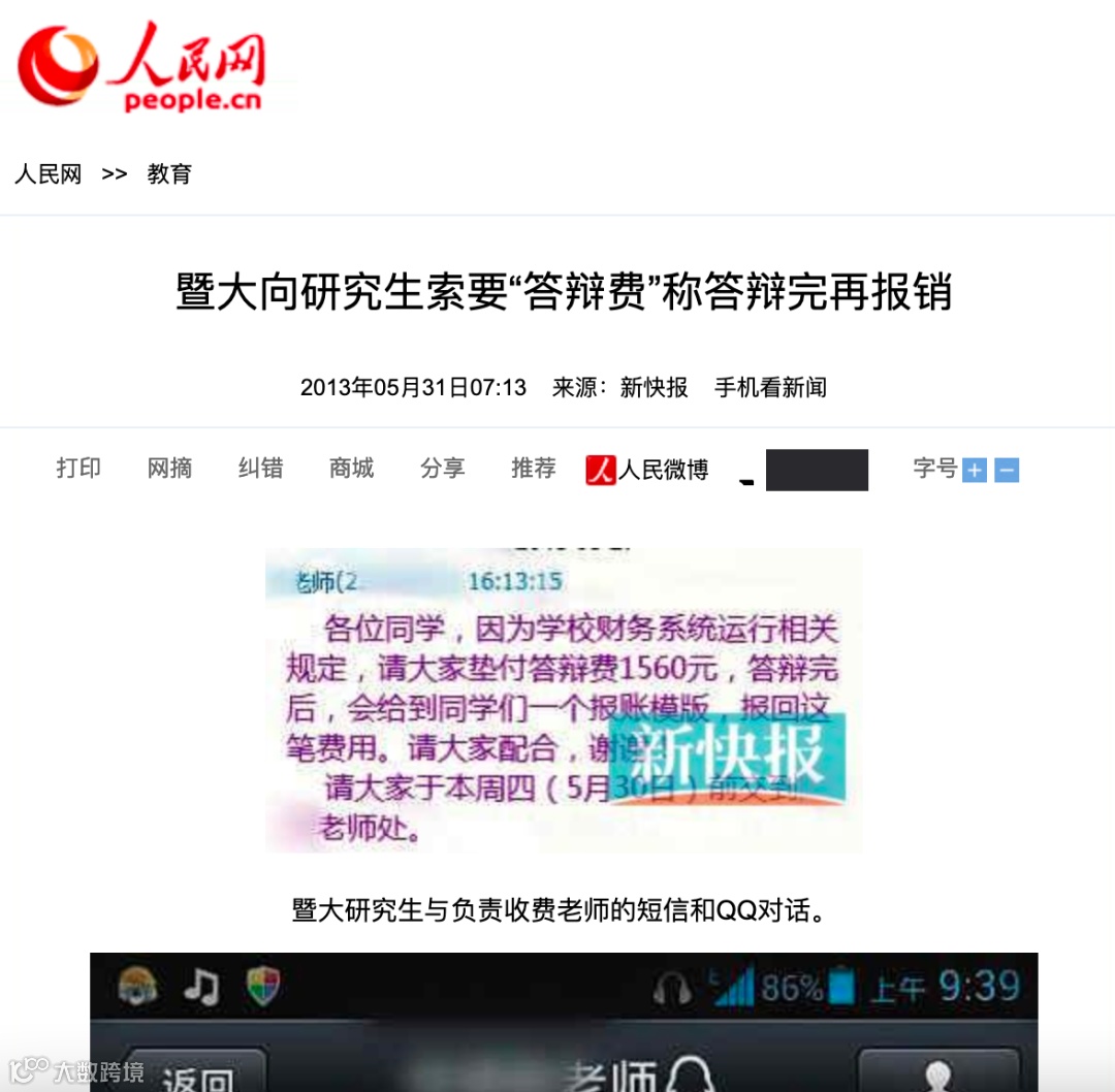 2013 年暨南大学曾因为收答辩费上过新闻,校方负责人否认答辩费的收取,称只是「毕业相关费用」,群里发布时没有解释清楚,但 QQ 群通知中「答辩费」三个字让辩解显得苍白无力。其他高校也有收取答辩费的通知,但一旦较真起来,马上就切换口径。