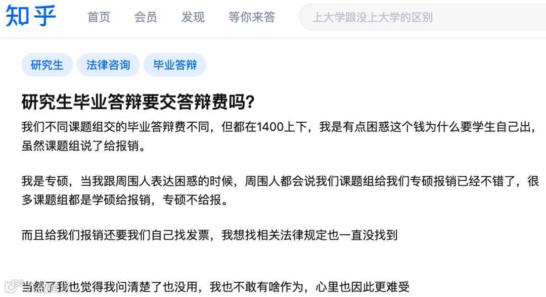 近日有同学在知乎上提问,学校为什么要收取两千元现金作为论文评审费和答辩费,不仅不提供发票和收据,且相较去年数额也有所上涨(难道答辩费也会通货膨胀?)
