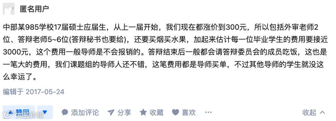 有些导师除了要求学生出答辩费之外,还提示学生要承办「答辩宴」等相关活动。不同学校之间就更是千差万别。