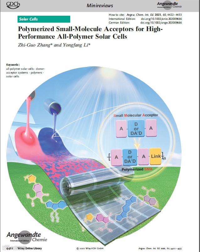 近年来,聚合物太阳能电池(PSCs)以其重量轻、价格低廉、可通过印刷方式制备大面积柔性器件等优势,得到了学术界和工业界的广泛关注,是重要的前沿研究领域。值得注意的是,由聚合物给体和聚合物受体构筑的全聚合物太阳电池(all-PSCs)在器件稳定性和机械柔韧性上具有独特优势,具有应用于可穿戴及柔性可拉伸光伏器件的潜力。而对于这一美好愿景,高性能聚合物受体是关键。在最新的一期的Angew. Chem. Int. Ed.上,北京化工大学张志国教授和中科院化学所李永舫院士将他们提出的“小分子受体高分子化”的概念(Polymerized Small Molecule Acceptors,PSMAs)以及近年的研究进展做了详尽介绍,并对未来发展给出了多项前瞻性的建议。