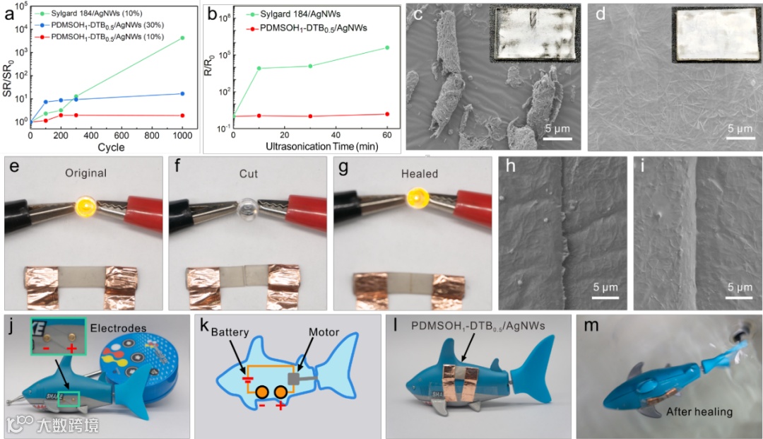 图4(a)使用Sylgard184/AgNWs弹性导体作为对照,PDMSOH1-DTB0.5/AgNWs弹性导体在10%和30%应变下的相对薄层电阻与循环次数的关系;(b)使用Sylgard184/AgNWs弹性导体作为对照,PDMSOH1-DTB0.5/AgNWs弹性导体超声稳定性;(c-d)Sylgard184 / AgNWs(c)和PDMSOH1-DTB0.5/AgNWs(d)的砂纸摩擦试验的SEM图像;(e-i)自愈前后PDMSOH1-DTB0.5/AgNW的照片(e-g)和SEM图像(h,i);(j-m)演示了以PDMSOH1-DTB0.5/AgNWs导体为电极的玩具鱼在超声浴中的坚固性,并在切割后实现了自愈合。