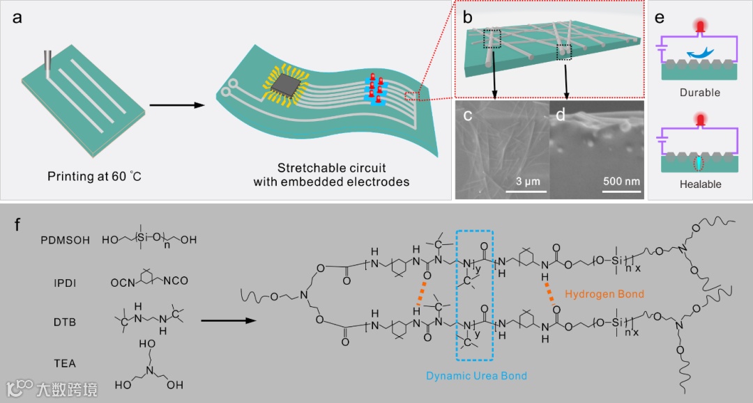 图1(a)具有嵌入导电表面的自愈合可拉伸电路的制备流程图;(b)PDMSOH1-DTB0.5/AgNWs电路放大图;(c, d)PDMSOH1-DTB0.5/AgNWs导体的表面和截面SEM图像;(e)将导电AgNWs部分嵌入弹性体表面,具有较高的鲁棒性,可抵抗划伤等严重损伤,并能自愈合;(f)PDMSOH1-DTBx聚合物网络结构示意图及反应物分子结构。