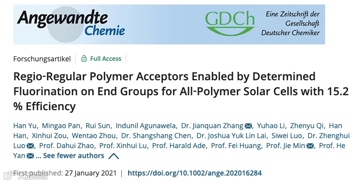 Angewandte Chemie:定位氟化端基引导区域规整聚合物受体有效提升全聚合物太阳能电池效率至15.2%!