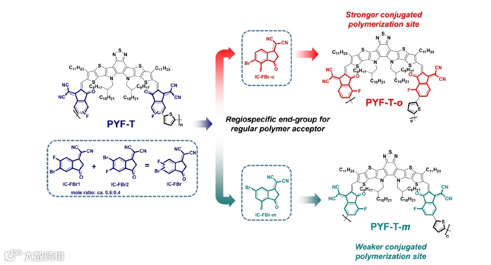 图3. 文章涉及的端基IC-FBr、IC-FBr-o和IC-FBr-m的化学结构,以及聚合物受体PYF-T、PYF-T-o、PYF-T-m的化学结构。